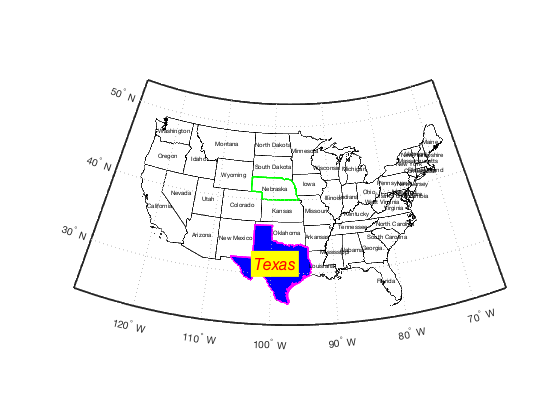 bordersm('texas','facecolor','blue','edgecolor','m','linewidth',2) bordersm('nebraska','g','linewidth',2) labelbordersm('continental us','fontsize',6); labelbordersm('Texas','color','r','backgroundcolor','y',... 'fontangle','italic','fontsize',16)
