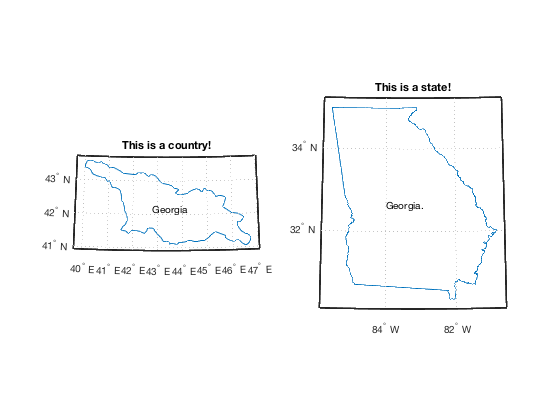 figure subplot(121) bordersm 'georgia' labelbordersm 'Georgia' title 'This is a country!' subplot(122) bordersm 'georgia.' labelbordersm 'Georgia.' title 'This is a state!'