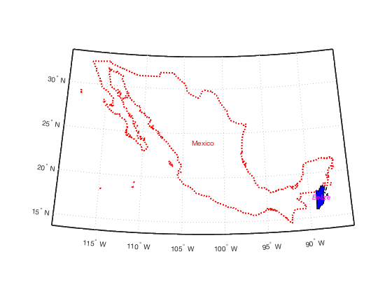 figure bordersm('mexico','r:','linewidth',2) hold on bordersm('belize','facecolor','b','linestyle','-','linewidth',1) labelbordersm('Mexico','color','r') labelbordersm('Belize','color','m','fontangle','italic')