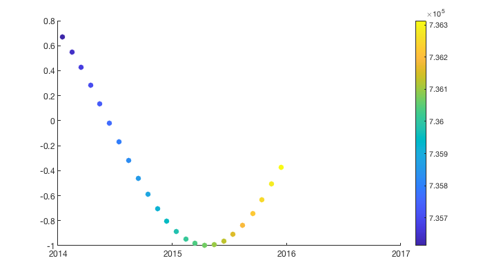 t = datenum(2014,1:24,15); y = sin(t/200); figure('pos',[100 100 700 400]) scatter(t,y,60,t,'filled'); datetick('x','yyyy') colorbar