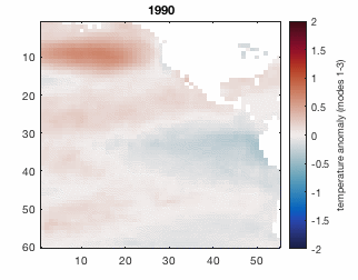 For example, a map of SST anomalies associated with the first three modes of variability, for a specified time, can be obtained by summing the eof maps of each of those modes, multiplied by their corresponding pc values for that time. You can do the summing manually, say, for the 1990's like this: