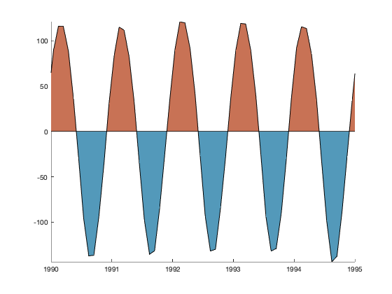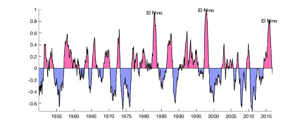 figure('pos',[100 100 600 250]) anomaly(t,-pc(1,:),'topcolor',rgb('bubblegum'),... 'bottomcolor',rgb('periwinkle blue')) % First principal component is enso box off axis tight datetick('x','keeplimits') text([724316 729713 736290],[.95 .99 .81],'El Nino','horiz','center')