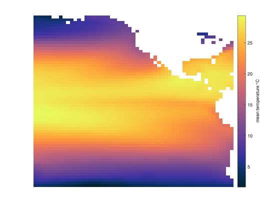 figure imagescn(lon,lat,mean(sst,3)); axis xy off cb = colorbar; ylabel(cb,' mean temperature {\circ}C ') cmocean thermal
