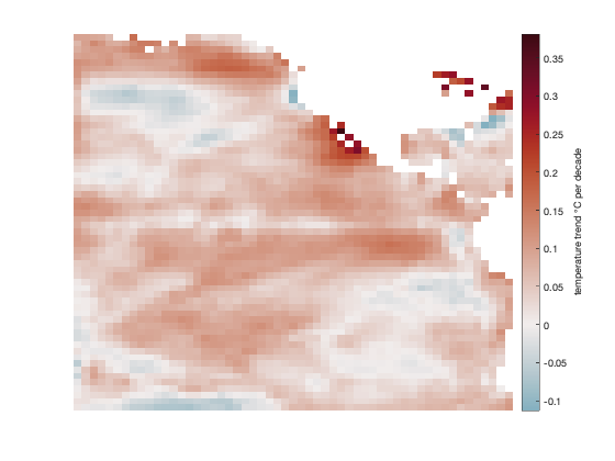 imagescn(lon,lat,10*365.25*trend(sst,t,3)) axis xy off cb = colorbar; ylabel(cb,' temperature trend {\circ}C per decade ') cmocean('balance','pivot')