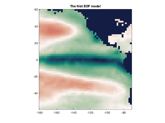 [eof_maps,pc,expv] = eof(sst); % Plot the first mode: figure imagesc(lon,lat,eof_maps(:,:,1)) axis xy image cmocean('curl','pivot') title 'The first EOF mode!'