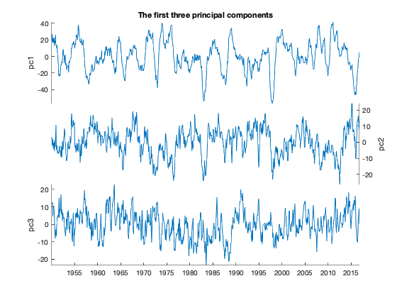 figure subsubplot(3,1,1) plot(t,pc(1,:)) box off axis tight ylabel 'pc1' title 'The first three principal components' subsubplot(3,1,2) plot(t,pc(2,:)) box off axis tight set(gca,'yaxislocation','right') ylabel 'pc2' subsubplot(3,1,3) plot(t,pc(3,:)) box off axis tight ylabel 'pc3' datetick('x','keeplimits')