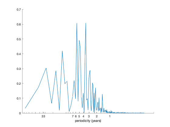 figure plotpsd(pc(1,:),12,'logx','lambda') xlabel 'periodicity (years)' set(gca,'xtick',[1:7 33])
