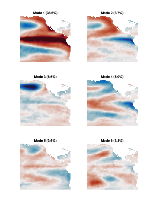 s = [-1 1 -1 1 -1 1]; % (sign multiplier to match Messie and Chavez 2011) figure('pos',[100 100 500 700]) for k = 1:6 subplot(3,2,k) imagescn(lon,lat,eof_maps(:,:,k)*s(k)); axis xy off title(['Mode ',num2str(k),' (',num2str(expv(k),'%0.1f'),'%)']) caxis([-2 2]) end colormap jet