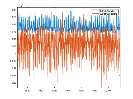 figure plot(t,slpA); hold on plot(t,slpB) axis tight legend('SLP at Gibraltar','SLP at SW Iceland')