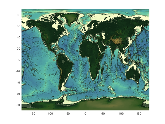 figure worldmap('world') cla % removes grid lines pcolorm(lat,lon,z) cmocean('topo','pivot') shadem(7,[225 75])