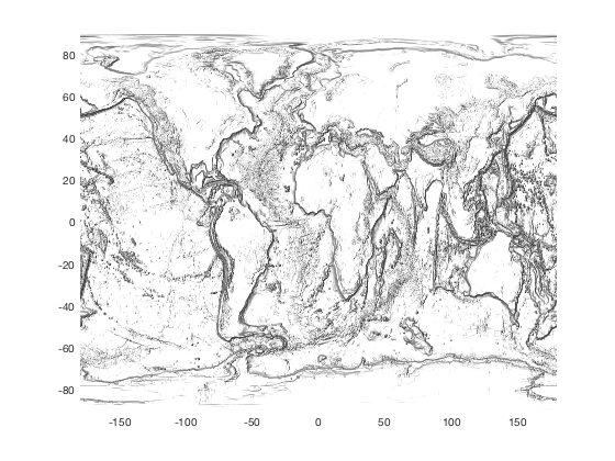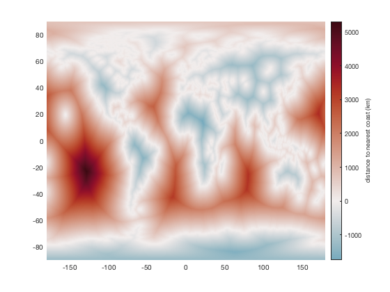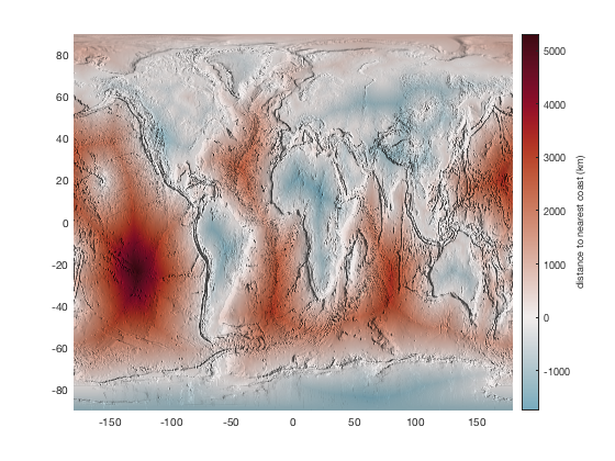 So perhaps you have some other variable you're really trying to put into perspective. For example, the distance to the nearest coast line, which can be obtained with dist2coast. For the same grid as Example 3, get the distances to the coast, and use island to set the land values to negative distances: