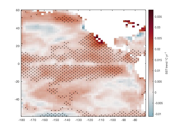 Here's a real-world application of stippling: Denote regions of statistically significant sea surface temperature trends with stipples. First, load the sample pacific_sst.mat dataset, which contains monthly gridded sea surface temperature data, and calculate trends and corresponding p-values with trend: