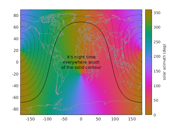 hold on contour(lon,lat,el,[0 0],'k') % solid zero contour contour(lon,lat,el,0:10:90,'k:') text(0,0,{'It''s night time';'everywhere south';'of the solid contour'},... 'horiz','center')