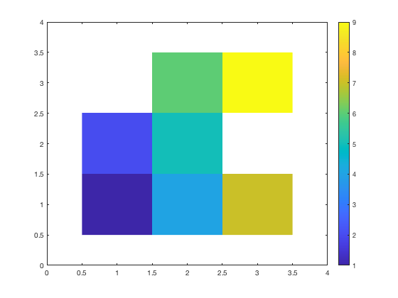 You can see the two missing values are filled by NaN. You can plot the gridded data with surf(X,Y,Z) or pcolor(X,Y,Z), but let's use imagescn instead: