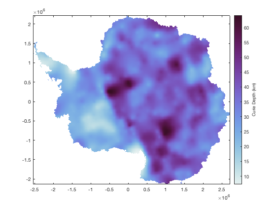 For this example, use load and plot Antarctic Curie depth data from Martos 2017: